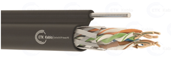 Cablu FTP de categorie 5e menit pentru utilizare în condiții exterioare, acesta este trossirat și ecranat, având 4 perechi cu fire de cupru solid de 24AWG (0,51 mm) fiecare. Trossul este format din sârmă de oțel galvanizat, asigurând o structură robustă și rezistentă. Învelișul exterior este fabricat din polietilenă neagră, special formulată pentru a rezista la radiațiile ultraviolete, ceea ce îl face potrivit pentru instalare în medii externe expuse la soare și intemperii.