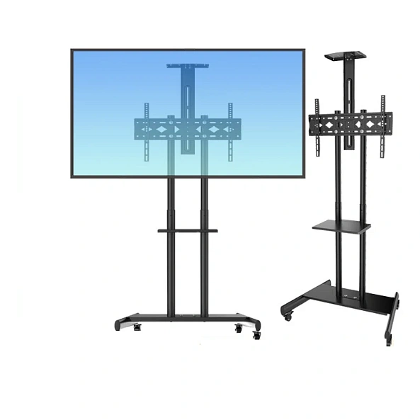 Stativul are o baza mobila pe role pentru deplasare pe podea in orice directie (rotatie role 360°). Pentru utilizare in birouri, sali de conferinte, sali de clasa si expozitii. Potrivit pentru monitoare cu diagonala de 32-65 inci. Raft suplimentar de 35×24 cm. Suport pentru montarea proiectorului. Inaltime reglabila de la 131 pana la 171 cm. Dimensiunea maxima a monturii VESA - 60×40 cm. Sarcina maxima de 50 kg. Dimensiunea bazei: 85×62 cm. Material de fabricaaie: oael laminat la rece.