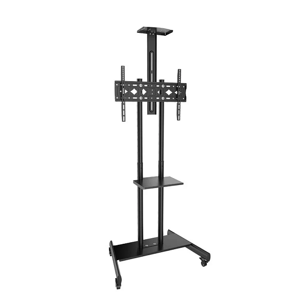 Stativul are o baza mobila pe role pentru deplasare pe podea in orice directie (rotatie role 360°). Pentru utilizare in birouri, sali de conferinte, sali de clasa si expozitii. Potrivit pentru monitoare cu diagonala de 50-120 inci. Raft suplimentar de 63×34 cm. Suport pentru montarea proiectorului. Inaltime reglabila de la 173 pana la 200 cm. Dimensiunea maximă a monturii VESA - 90×60 cm. Sarcina maxima de 120 kg. Dimensiunea bazei: 101×51 cm. Material de fabricatie: otel laminat la rece