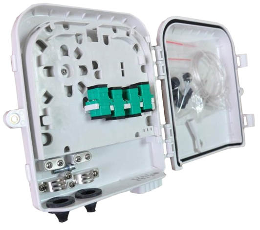 Распределительный оптический бокс представляет собой прочный пластиковый корпус с расположенными внутри элементами фиксации кабеля и оптических соединителей.