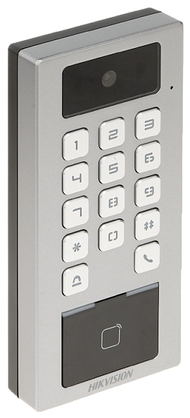 Интегрированный терминал управления системой контроля доступа с встроенным считывателем карт поддерживает интеграцию с системами IP-домофонии (вызов абонентов с терминала) и протоколом SIP. Двусторонняя аудиосвязь через встроенные микрофон и динамик. Встроенный считыватель карт доступа Mifare (до 100 000 карт и 300 000 событий). Удаленное управление и контроль через приложение Hik-Connect.