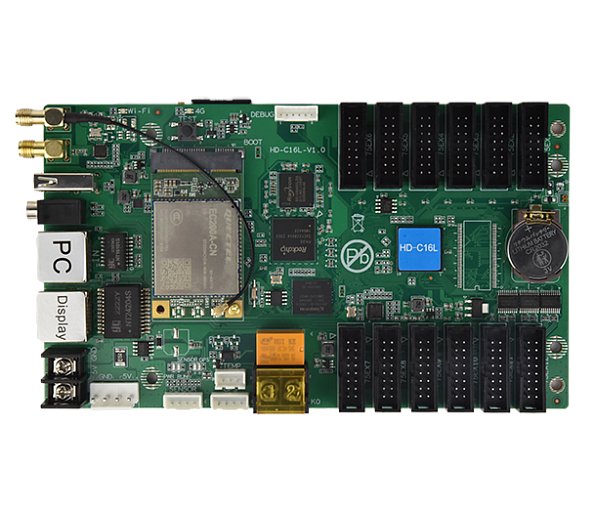 SH-C16L Полноцветный светодиодный контроллер. макс.разрешение 650000 пикселей каскадно, нагрузка на одну карту 200000 пикселей; Сетевой интерфейс 1 порт 100Mbit In, 1 порт 1000Mbit Out; Wi-Fi, Аудио выход TRS 3,5 мм; поддержка беспроводного управления через приложение мобильного телефона. Поддерживает асинхронное воспроизведение. USB 2.0 Реле: 1x DC 30V-3A