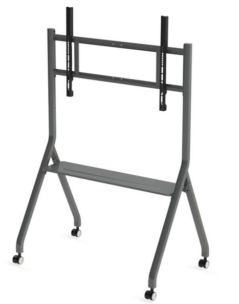 Мобильный стенд с полкой для интерактивного дисплея и мониторов. Стойка имеет основание на роликах для передвижения по полу в любом направлении (поворот роликов 360°). Применяется для использования в офисах, переговорных комнатах, учебных классах и на выставках. Подходит для мониторов диагональю 55/65/75 дюймов. Материал изготовления: сталь холодного проката. Размер в собранном виде: 1160×1683×750мм.
