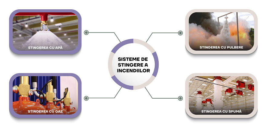 Astfel, stingerea cu apă este o soluție universală pentru majoritatea clădirilor, însă pentru obiective cu echipamente costisitoare sau riscuri speciale se recomandă sistemele cu gaz, pulbere sau spumă.